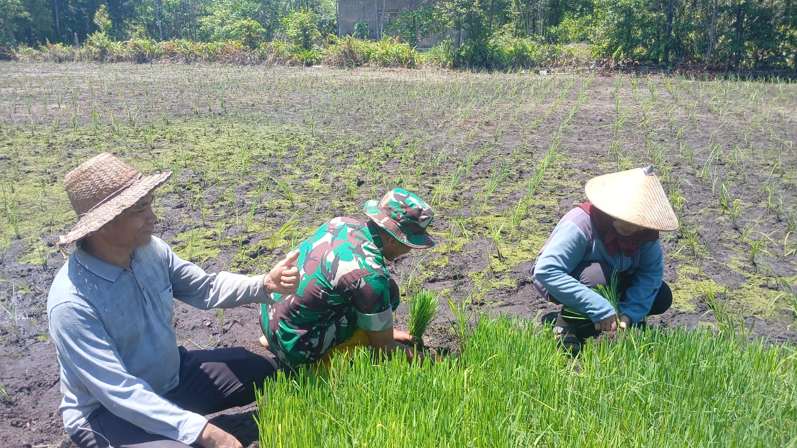 Dalam kegiatan itu, Babinsa turut serta bersama petani menanam padi sekaligus memberikan dorongan semangat kepada para anggota kelompok tani agar tetap giat mengolah lahan pertanian.